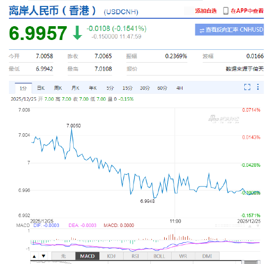 临近年末,外汇市场波澜再起。2025年12月25日,离岸人民币对美元汇率升穿7.0这一关键心理关口,最低触及6.99853元,为2024年以来的首次。与此同时,人民币对美元中间价连续调升,于25日报7.0392,同样创下逾一年新高。